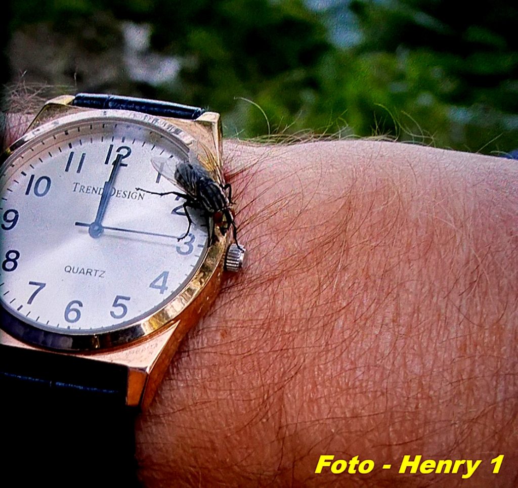 Da es kaum vorkommt, dass sich eine Fliege um 12 Uhr auf eine Armbanduhr setzt – brachte ich hier dieses Foto.